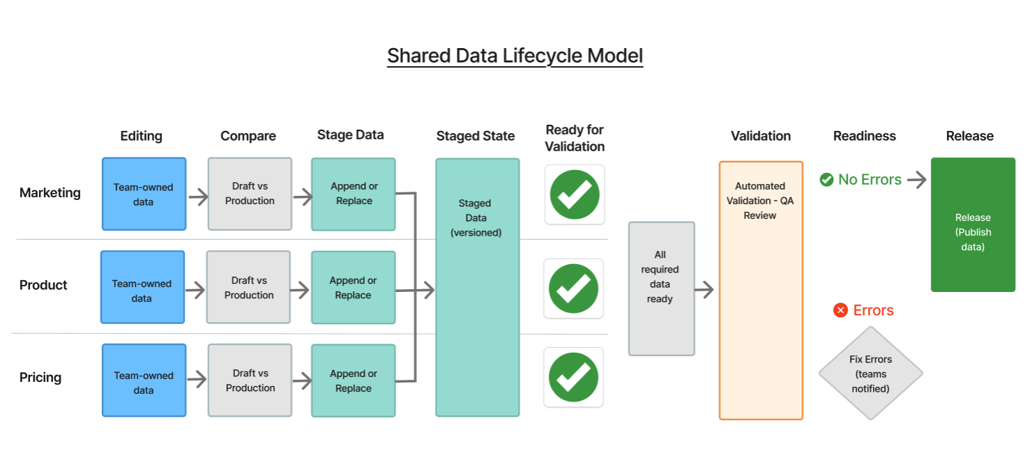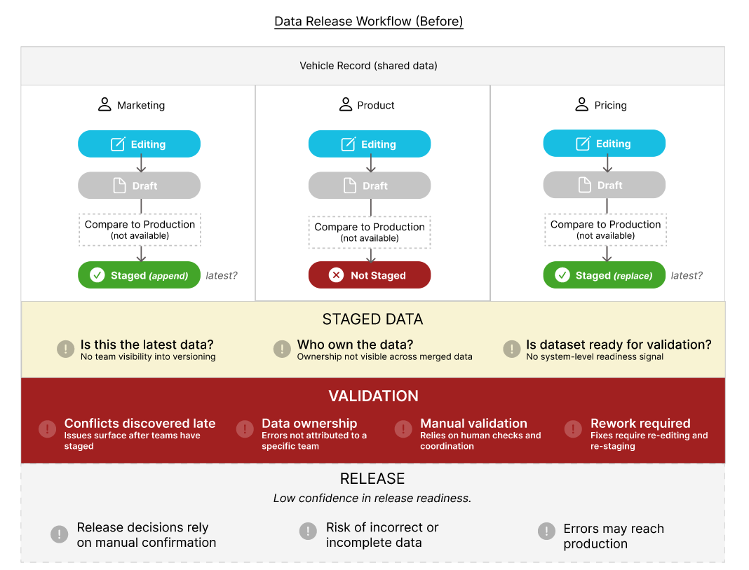 Problem: Multiple teams worked on shared data within the same platform, but the system had no concept of shared state or readiness. Also ownership, while enforced through permissions - was not visible where cross-team coordination was required. This led to version conflicts, manual coordination, and unreliable releases.