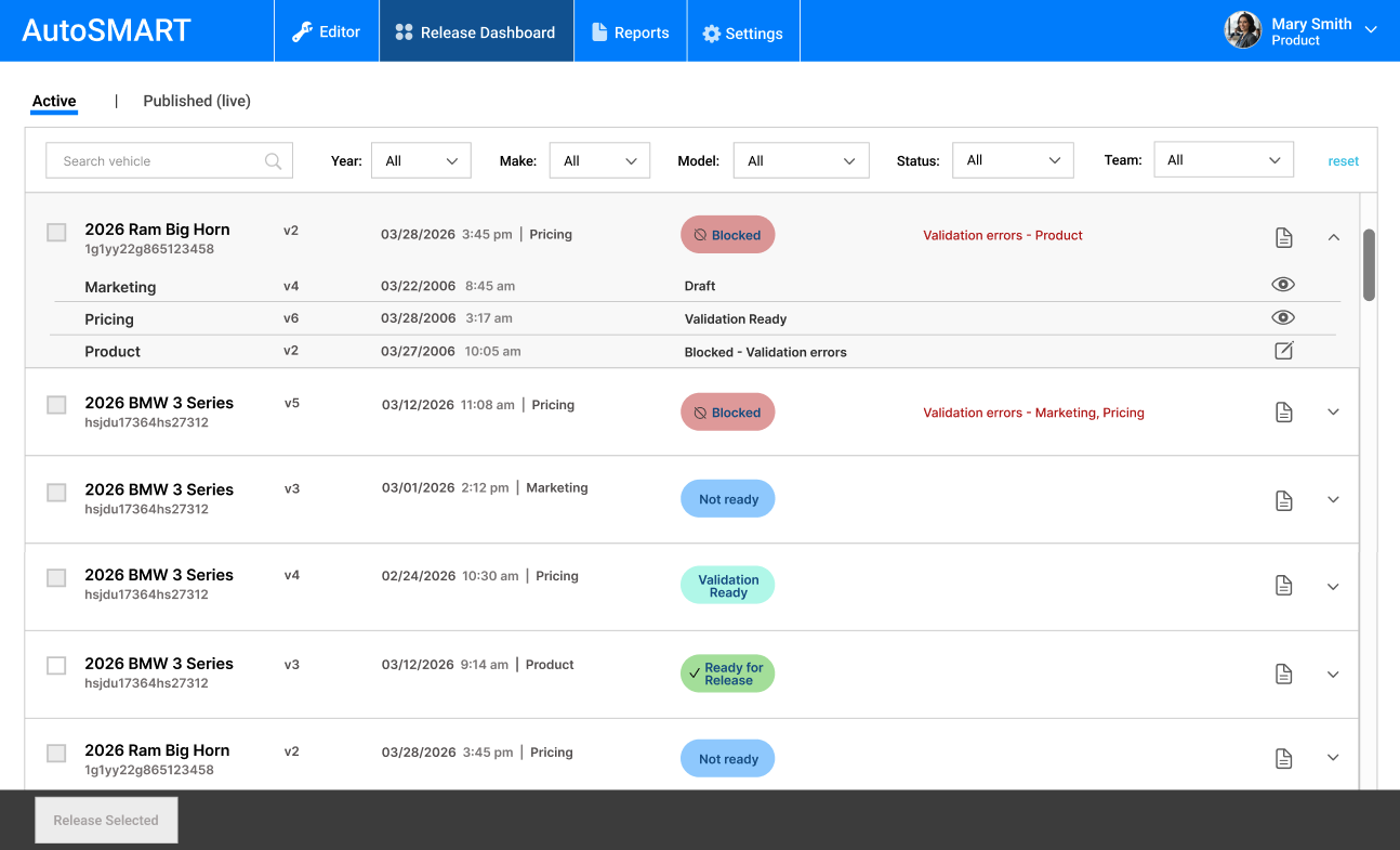I led UX for a core workflow within an enterprise automotive platform used by marketing, pricing, and product teams to manage vehicle data prior to release. While permissions restricted who could edit specific data, once changes were staged and merged, ownership was no longer visible - making coordination and issue resolution difficult.
